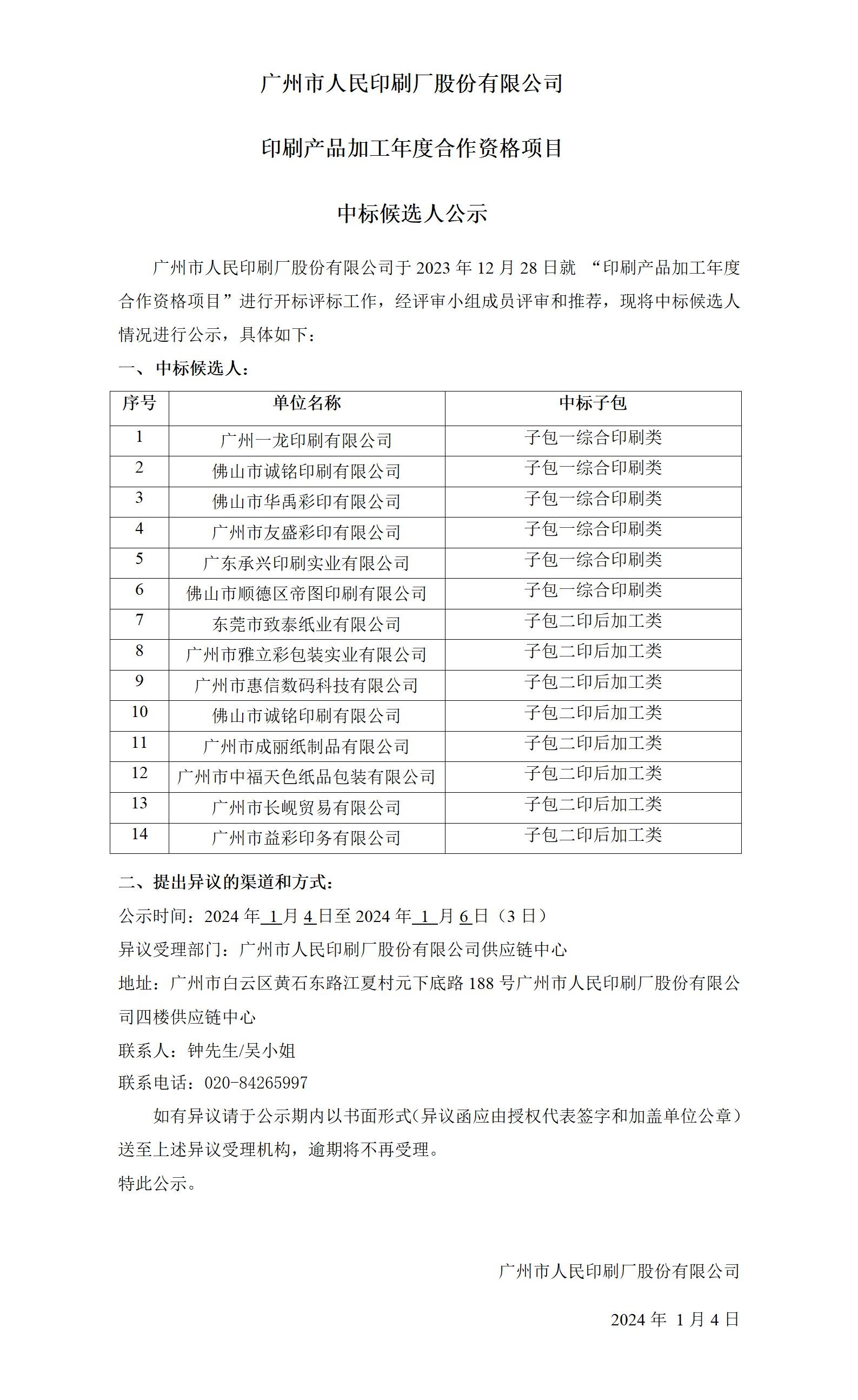 广州市人民印刷厂股份有限公司印刷产品加工年度合作资格项目中标候选人公示